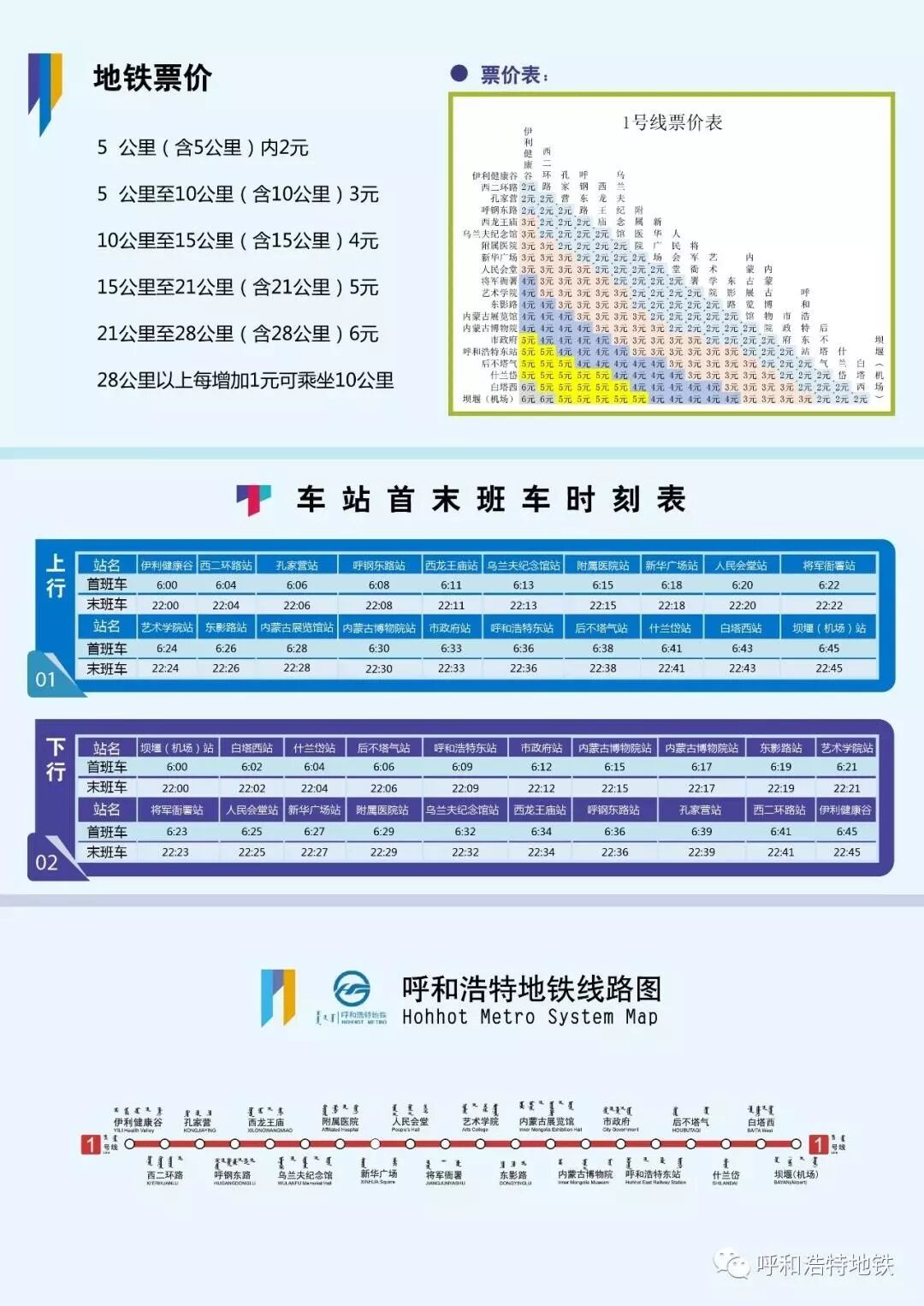 呼和浩特市城市轨道交通建设规划编制工作于2012年底正式启动,2015年4月,经国务院批准,国家发改委正式批复,成为全国第39个获批建设城市轨道交通的城市。我市城市轨道交通1号线一期工程西起伊利健康谷站,东至坝堰(机场)站,线路全长21.719千米;共设车站20座,其中地下站16座、高架站3座、地面站1座,平均站间距1187米,最大站间距1953米,最小站间距748米;线路西段设三间房车辆基地,东端设白塔停车场,设西龙王庙和南店110KV主变电所2座。线路采用DC1500V架空接触网供电,B型车,6辆编组,列车最高运行速度 80km/h。1号线一期工程采取PPP模式,与社会投资人中国中铁股份公司合作建设,工程投资概算约170.57亿元。工程项目于2016年4月1日正式开工,同年11月23日首座车站呼钢东路站主体结构封顶,2017年3月20日“草原雄鹰号”盾构机始发掘进,2018年6月19日北京市地铁运营有限公司合作开展运营筹备,11月26日全线洞通,2019年1月13日首列电客车在长春下线,4月30日南店110KV主变电所一次性授电成功,6月22日全线地下站环网送电,8月13日全线长轨贯通,9月6日进入试运行阶段。进入11月份以来,先后组织完成档案验收、特种设备验收、消防验收、人防验收、卫生评价和工程质量验收,取得电价、票价批复,完成应急处置演练,制定公交一体化接驳方案,12月23日通过项目竣工验收,27日通过初期运营前安全评估。从开挖“第一钻”至今,在市委、市政府的坚强领导下,在各级领导、有关单位和社会各界的大力支持下,市轨道交通公司认真学习贯彻习近平新时代中国特色社会主义思想,深入贯彻新时代党的建设总要求,牢固树立以人民为中心的发展理念,传承发扬吃苦耐劳一往无前的蒙古马精神和伟大的奋斗精神,守正创新,行稳致远,创造了业内罕见的“青城速度”。项目建设历经三年九个月,迁改燃气、电力、热力、给排水、强弱电管线长达7.1万米,迁移绿化207亩、5.5万棵,导改交通24.1万平米,征收土地942亩,征拆房屋17.7万平米。施工中,克服安全风险,成功下穿建筑物、桥梁、通道、河流和铁路等28次,侧穿建筑物众多;创新应用BIM等技术,获得自治区级工法8项,获得发明专利5项,实用新型专利12项;荣获内蒙古自治区建筑工程优质结构金奖2项、银奖4项、自治区建筑业绿色施工示范工程3个。地铁1号线制票价执行标准:0-5公里(含)2元,5-10公里(含)3元,10-15公里(含)4元,15-21公里(含)5元,21-28公里(含)6元,28公里以上每增加1元可继续乘坐10公里。地铁1号线运营时间为 6:00-22:00,上下行首列车 6:00从伊利健康谷站和坝堰(机场)站同时发出,采用单一交路方式组织行车,高峰期列车间隔8分钟,平峰期列车间隔10分钟,晚20:00后列车间隔12分钟,最大上线车组数约为13辆。目前,市民可以购买票卡或通过手机下载APP绑定支付宝购票乘坐地铁。60周岁至69周岁老年人、中小学学生、环卫工人凭卡享受单程票价5折优惠,70周岁以上老年人、军人、消防员凭证免费乘车。(来源:呼和浩特地铁)
